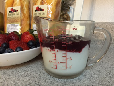 Then mix one cup of yogurt and 1/4 cup of your favorite all fruit spread. This ends up being a delicious dessert topping that I am sure we will find more uses for in the future.