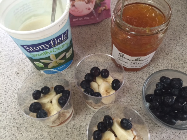 What's awesome about yogurt parfaits is the fact there are no rules, you can really layer it how you want. You can see from the image below we chose to go yogurt, peach preserves, yogurt, granola, banana, blueberries. The kids ended up mixing everything up. Again, no wrong way to enjoy your yogurt parfait!